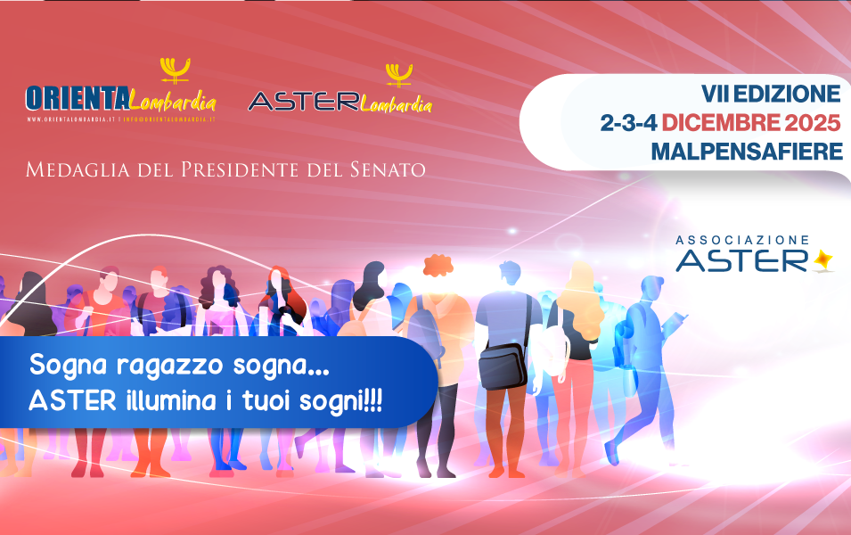 Siamo felicissimi di inaugurare i lavori della settima Edizione di OrientaLombardia-ASTERLombardia, imponente Fiera ASTER rivolta alle Scuole Superiori di tutta la Lombardia. Rivolgiamo a tutti Voi il nostro più sincero augurio che questo sia l’inizio di una nuova serie di eventi che, nei prossimi anni e decenni, siano al servizio di questa e della successiva generazione. Siamo lieti di condividere con Voi un nostro importante motivo di gioia e di festa: ASTER ha compiuto vent’anni! Questo traguardo ci invita a continuare il nostro lavoro con lo slancio e la passione dei primi anni e con lo sguardo sapiente, frutto dell’esperienza maturata con gli anni.